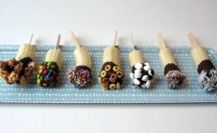 Бананы в шоколадной глазури легко готовить и очень интересно украшать. Чтобы приготовить такие съедобные поделки, нанижите половинки бананов или других фруктов на шпажки, обмакните в шоколад и украсьте присыпкой, орехами или дробленой карамелью.
