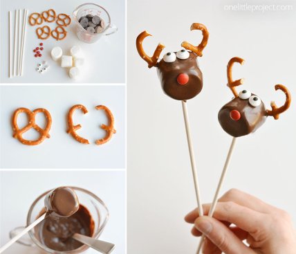 Смешные и милые олени Санты получатся, если зефирки нанизать на шпажки и окунуть в расплавленный шоколад. Рожки можно сделать из сахарных мини-крендельков, а носик и глаза — из конфеток M&M's.