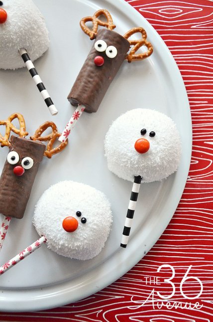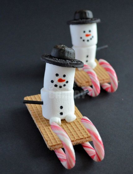 А если добавить печенье, вафли и палочки-леденцы, получатся симпатичные снеговики на санках, которые мчатся к вашему праздничному столу.
