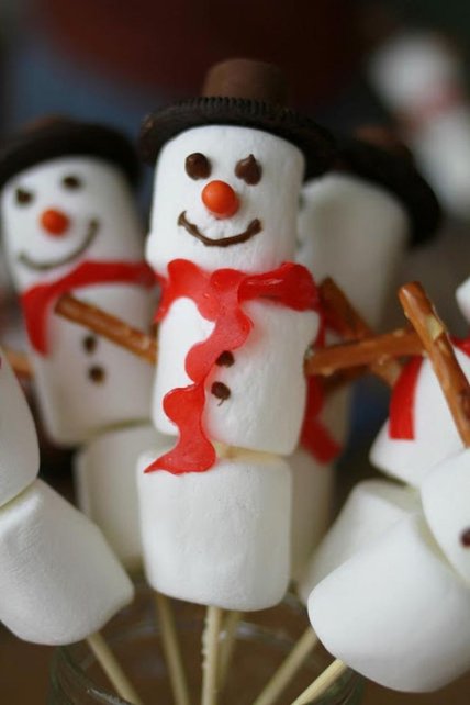 Из таких же зефирок получаются забавные снеговички. Глаза, пуговки и прочие атрибуты можно сделать из сливочного крема или кондитерской глазури.