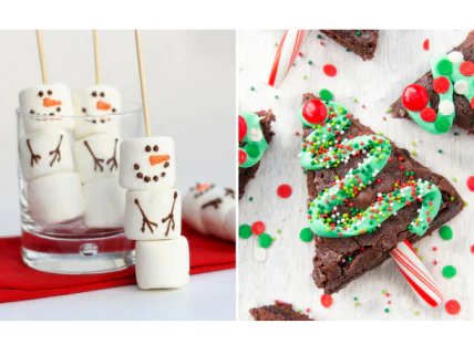 А если добавить печенье, вафли и палочки-леденцы, получатся симпатичные снеговики на санках, которые мчатся к вашему праздничному столу.