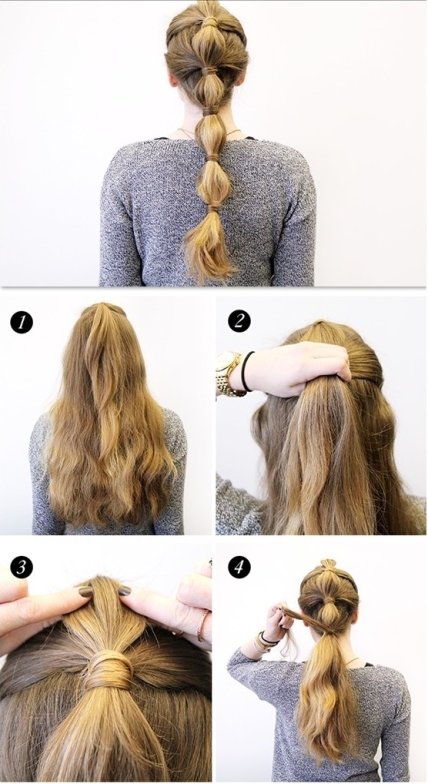 Красивый и необычный объемный хвост. Волосы, уложенные таким образом, кажутся еще длиннее и пышнее. Чтобы делать эту прическу в школу на длинные волосы, девочкам придется потренироваться. Важно аккуратно обернуть прядкой волос каждую резинку, которая присутствует в прическе.