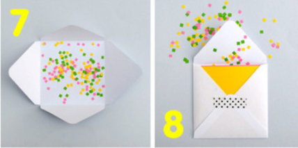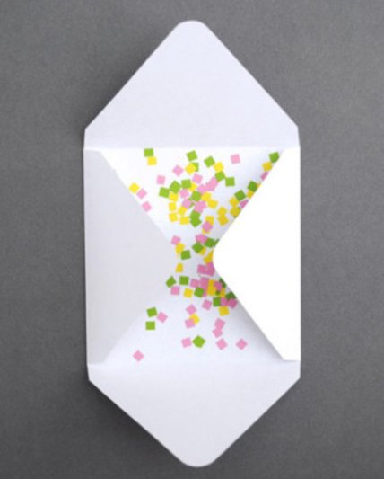 - Сделайте конверт, сложив лист белой бумаги по схеме, добавьте внутрь конверта немного конфети