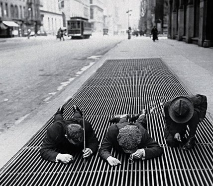 Три мальчика вылавливают мелочь из водостока во время Великой депрессии, Нью-Йорк, 1930