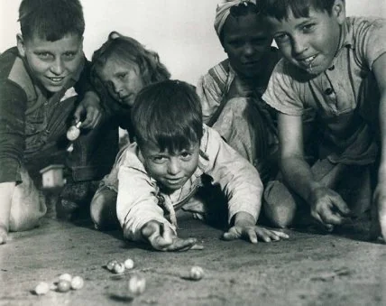 Дети играют «Push The Peanut», улица Кингс-Кросс Лондон, 1938. Суть игры - первым докатить арахис носом до черты