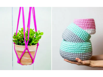 Украсить дом милым цветочным кашпо, сплетенным в технике макраме можно, даже если вы только что впервые увидели это слово. Сплетите с помощью макраме кашпо для цветов из старых детских футболок. Получится красиво и необычно.