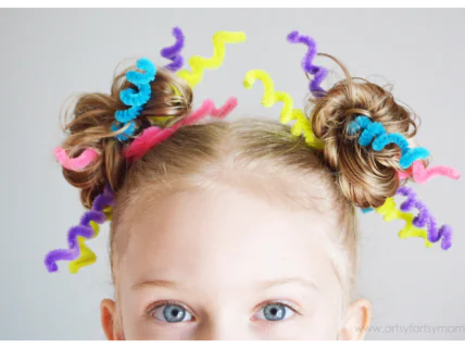 Чтобы сделать девочке прическу на Хэллоуин как у кукол Лалалупси, необходимо запастись цветными бумажными спиралями (режем полоски из цветной бумаги и накручиваем их на карандаш) или цветной пушистой проволокой. Сначала ребенку завязываем два хвоста или пучка, и прикреплаем к ним разноцветные спирали при помощи шпилек или невидимок.