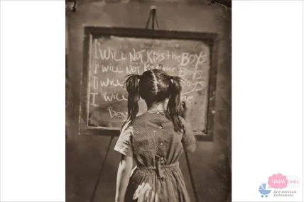 В своей серии "Пороки или "Я не буду"" она с иронией показала прием воспитания популярный в некоторых странах, когда детей заставляют снова и снова писать о своем проступке или обещать не повторять его.