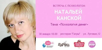 Это будет особая встреча! Нас ждет общение с известным психологом Натальей Канской на тему «Психология денег». Мы сможем осознать свои ограничения на пути к богатству, а, что наиболее важно, увидеть, почувствовать и принять новые мыслительные и поведенческие стратегии, чтобы стать обеспеченным и процветающим человеком!
