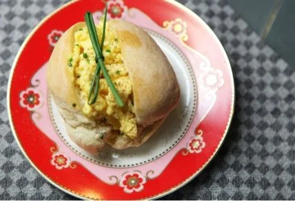 Итак, встречайте: горячая домашняя булочка, омлет, козий сыр и шнитт-лук!