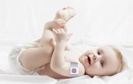 Это гаджет в виде браслетика, на внутренней стороне которого расположен небольшой, но очень чувствительный температурный датчик, который и замеряет температуру ребенка.