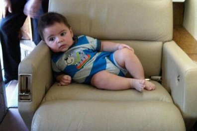 Футболист порадовал фанатов свежими снимками 5-месячного малыша, опубликовав их в Твиттере. На фото Милан, который всюду путешествует со звездными родителями, разлегся в кресле самолета. Мальчик настолько крошечный, что его ножки еще пока даже не достают до края сидения.