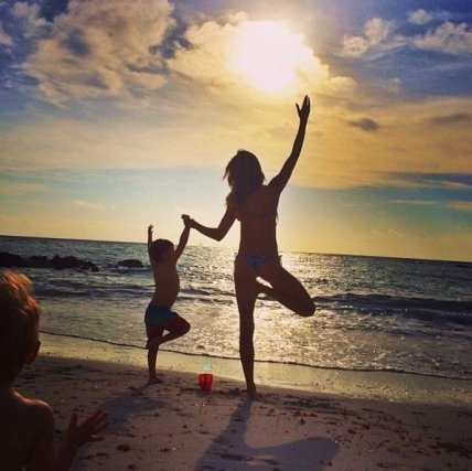 Супермодель Жизель Бундхен с удовольствием занимается йогой и стретчингом с сыном Бенджамином при любой возможности, а на берегу моря тем более.