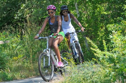 Первая леди США Мишель Обама с дочками предпочитает езду на велосипеде. Кстати, она любит тренироваться рано утром, в 4.30, пока рядом нет толпы поклонников.