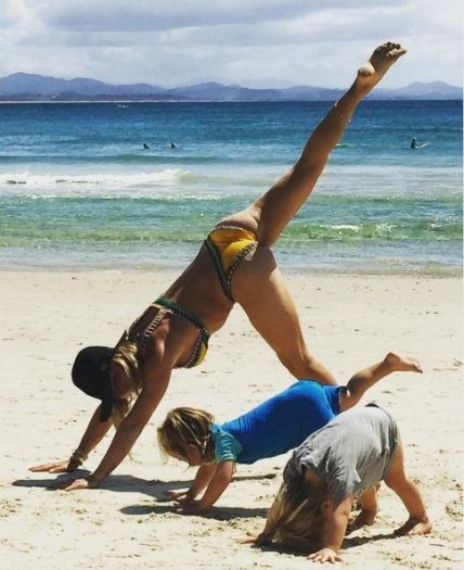 Актриса и модель, а также супруга актера Криса Хэмсворта, Эльза Патаки, идет на пляж не только купаться и загорать. Вместе со своими с сыновьями-близняшками Тристаном и Сашей они проводят там занятие по йоге. И мама, и дети в восторге.
