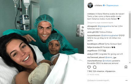 На фотографии — сам Роналду, его первый сын Криштиану-младший, новоиспеченная мама Джорджина Родригес и крохотная дочка нескольких минут от роду.