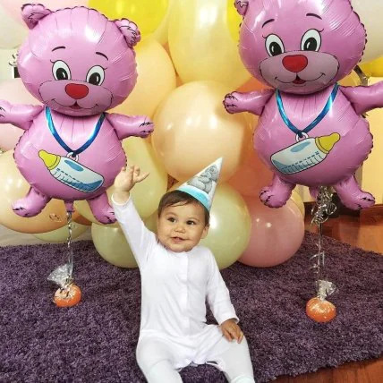 Звездное семейство украсило свой дом ярким воздушными шарами, которые очень понравились маленькой именинницеТакже Лее преподнесли большой торт, украшенный милыми фигурками мишек Тедди.
