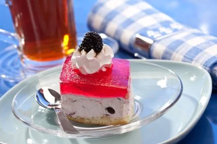 В первую часть (слой) добавьте черничный сок и ежевику. Отправьте форму в холодильник до застывания (приблизительно 15 минут). Во второй слой добавьте вишневый сок и малину. Когда 2 часть застынет, приступите к 3 слою. Он будет состоять из икры. Отправьте растительное масло в морозилку на 2-3 часа. Сок смородины смешайте с водой и сахаром. Добавьте агар-агар. Отправьте смесь на плиту, доведите до кипения и проварите. Наберите содержимое в пипетку или шприц и по капле выпустите в холодное масло. Получившиеся шарики промойте в холодной воде от остатков масла. Когда последний слой будет готов, отправьте десерт на 3 часа в холодильник. Далее нарежьте его на кусочки и подайте к столу.