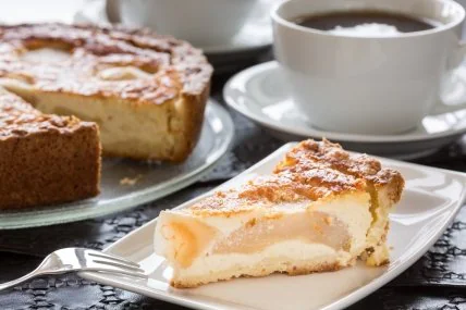 Груши поставить в форму с готовым коржом. Вылить заварной крем вокруг них. Выпекать около 25 минут (крем должен загустеть) при температуре 180 С. Готовый пирог вынуть из духовки, дать остыть минут 40.