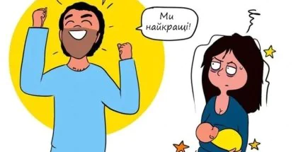 "Так! 9 місяців вагітності, постійна нудота, тренувальні перейми довжиною в тиждень, стрімкі пологи без анестезії… Це було нелегко, але ми це зробили. Ми найкращі!", – каже татусь на ілюстрації.