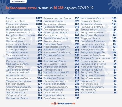 За даними російського Міністерства охорони здоров’я, за минулу добу в РФ коронавірусом захворіли 36 339 громадян, при цьому було зафіксовано 1036 смертей — черговий "рекорд" по летальним наслідкам, який Росія б’є вже три дні поспіль.