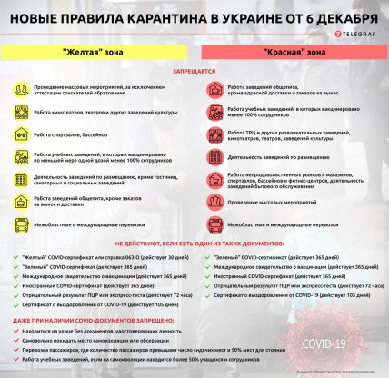 Додамо, що станом на 6 грудня в Україні 18 областей та столиця відповідають вимогам "червоної" зони. П’ять областей — Закарпатська, Кіровоградська, Тернопільська, Чернівецька та Харківська — мають показники "жовтої" зони. У "помаранчевій" поки що знаходиться лише Полтавщина.