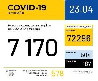 За даними ЦГЗ, станом на 9:00 23 квітня в Україні 7170 лабораторно підтверджених випадків COVID-19, з них 187 летальних, 504 пацієнти одужали. За добу зафіксовано 578 нових випадків.