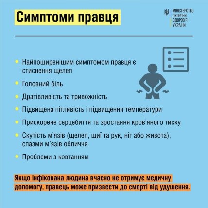 Є кілька конкретних симптомів правця, але найбільш поширеним є стиснення щелеп. Також людина регулярно жаліється на сильні головні болі та підвищену пітливість. Детальніше — в інфографіці від МОЗ.