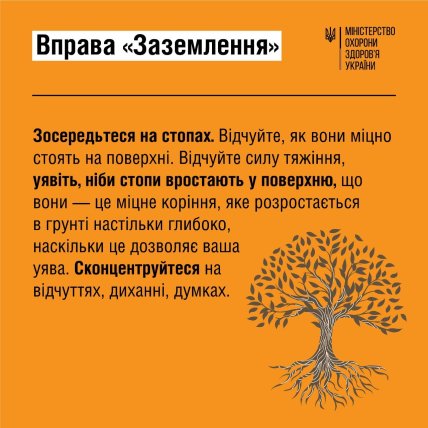 Якщо відчуваєте, що через тривогу та паніку втрачаєте контроль над собою, спробуйте техніку "заземлення". Дуже важливо вивести себе зі стану безпорадності. Для цього зверніть увагу на свої стопи — "як я стою на землі і вона мене тримає, дає мені опору" і сконцентруйтеся на диханні. Глибоко вдихайте та видихайте, а потім змінюйте темп дихання. Зосередьтеся на тому, що ви можете контролювати в цей момент.