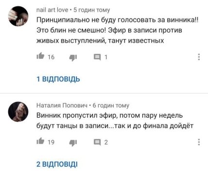 У коментарях прихильники співчуваючи парі і бажають якнайшвидшого одужання. Але є і такі користувачі, які проти записаних виступів, а також заявляють, що більше не будуть голосувати за пару №14.
