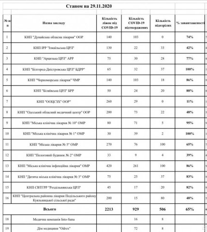 А вот в Одесской ОГА утверждают, что больницы по городу загружены на 65%, о чем свидетельствуют данные на 29 ноября.