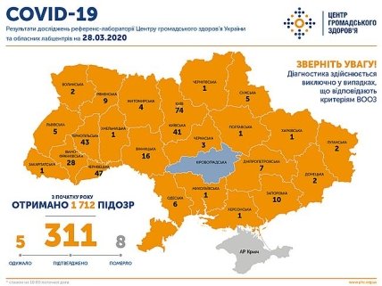 По данным Центра общественного здоровья, по состоянию на 10:00 28 марта в Украине 311 лабораторно подтвержденных случаев COVID-19, из них восемь летальных, пять пациентов выздоровели (четыре взрослых, один ребенок).