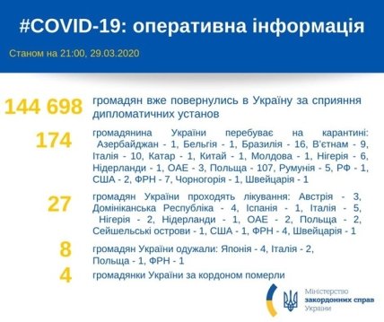 На фоне вспышки новой коронавирусной инфекции, по состоянию на вечер воскресенья, 29 марта, в Украину из-за границы вернулись более 144 698 украинцев.