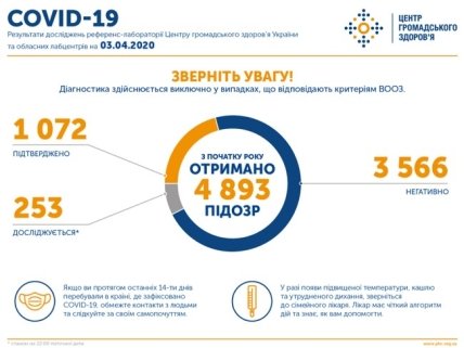 По состоянию на 22:00 3 апреля в Украине ПЦР-исследованием лабораторно подтверждено 1072 случая коронавирусной инфекции.