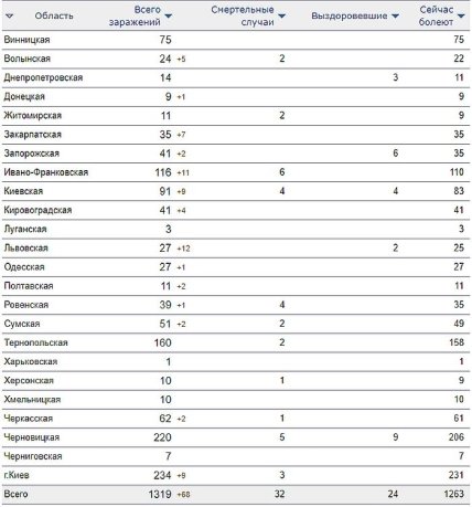 количество выявленных случаев коронавируса в Украине возросло до 1319;
