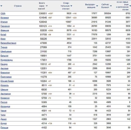 Из стран с наибольшим числом выявленных случаев COVID-19 самая низкая смертность от заболевания сохраняется в Германии - там 100 123 заболевших, 1584 умерших и 28 700 выздоровевших.