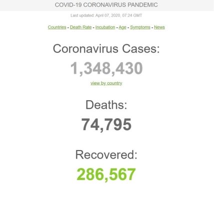 По состоянию на утро вторника, 7 апреля, общее количество умерших от инфекции, вызванной новым коронавирусом SARS-CoV-2, в мире составляет 74 744 человека.