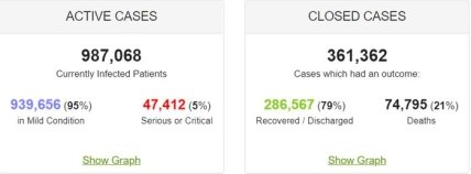 На данный момент на планете более 987 тыс. активных случаев заболевания COVID-19, из них примерно 5% — люди в тяжелом и критическом состоянии.