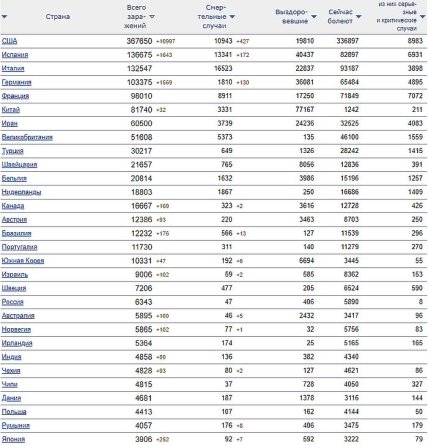 Из них значительная часть приходится на Италию (15 887), Испанию (13 169) и США (9 689). Четвертое место в мире по числу умерших теперь занимает Франция (8 078), а пятое — Великобритания (4 934).