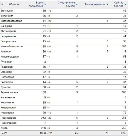 На 8 апреля 2020 в Украине насчитывалось 1668 заразившихся, из них 52 летальных, 35 пациентов выздоровели. За сутки было зафиксировано 206 новых случаев.