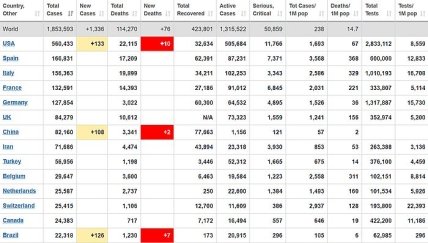 В Испании число больных достигло 166 тыс. 831 при 17 тыс. 209 умерших, Италии - 156 тыс. 363 (19 тыс. 899), Франции - 132 тыс. 591 (14 тыс. 393), Германии - 127 тыс. 854 (3 тыс. 022), Великобритании - 84 тыс. 279 (10 тыс. 612), Иране - 71 тыс. 686 (4 тыс. 474), Турции - 56 тыс. 956 (1 тыс. 198), Бельгии - 29 тыс. 647 (3 тыс. 600), Нидерландах - 25 тыс. 587 (2 тыс. 737), Швейцарии - 25 тыс. 415 (1 тыс. 106), Канаде - 24 тыс. 383 (717), Бразилии - 22 тыс. 318 (1 тыс. 230).