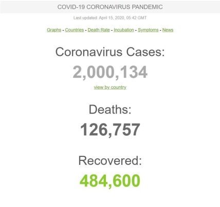 На 15 апреля количество случаев коронавируса Covid-19 в мире достигло 2 000 134.