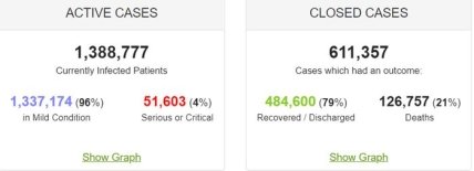 На данный момент на планете свыше 1,38 миллиона активных случаев заболевания COVID-19, из них примерно 4% — люди в тяжелом и критическом состоянии.