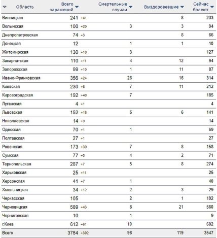 Заражение коронавирусом по областям Украины на 15.04.2020