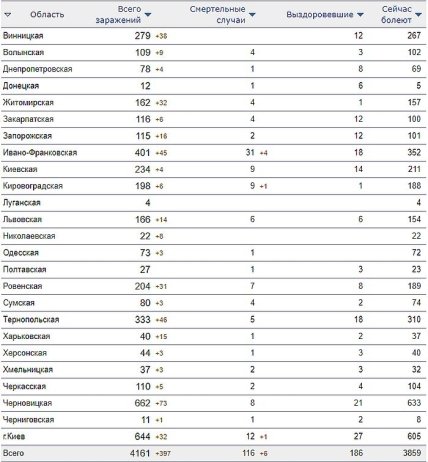 Заражение коронавирусом по областям Украины на 16.04.2020
