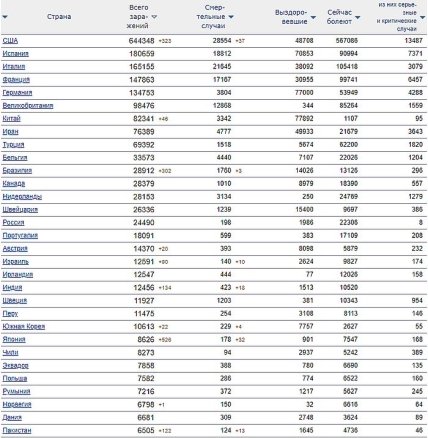 В Испании число больных достигло 180 тыс. 659 при 18 тыс. 812 умерших, Италии - 165 тыс. 155 (21 тыс. 645), Германии - 134 тыс. 753 (3 тыс. 495), Франции - 134 тыс. 582 (17 тыс. 167), Великобритании - 99 тыс. 489 (12 тыс. 868), Иране - 76 тыс. 389 (4 тыс. 777), Турции - 69 тыс. 392 (1 тыс. 518), Бельгии - 33 тыс. 573 (4 тыс. 440), Бразилии - 28 тыс. 912 (1 тыс. 760), Нидерландах - 28 тыс. 316 (3 тыс. 134), Канаде - 28 тыс. 253 (1 тыс. 010), Швейцарии - 26 тыс. 336 (1 тыс. 239), России - 24 тыс. 490 (198).