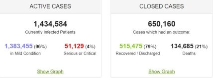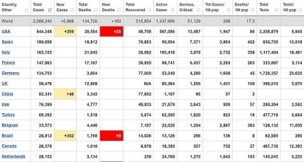 07:47 На утро 16 апреля в мире зафиксировали 2 084 744 заражений коронавирусом SARS-CoV-2, 134 685 человек умерли, 515 475 пациентов вылечились от COVID-19.