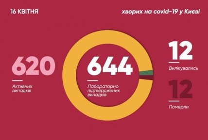 "Количество киевлян, у которых лабораторно подтвердили заболевание коронавирусом, за минувшие сутки увеличилось еще на 32 человека. Из них - один медик. За прошедшие сутки в столице, к сожалению, еще 1 летальный случай. Всего в Киеве уже 644 подтвержденных случаи заболевания COVID-19 ", - сказал Кличко в ходе онлайн-брифинга.
