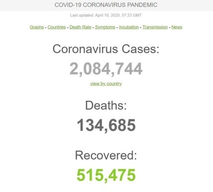 На утро 16 апреля в мире зафиксировано более 2 млн случаев COVID-19, более 130 000 человек умерли, более полумиллиона человек выздоровели.