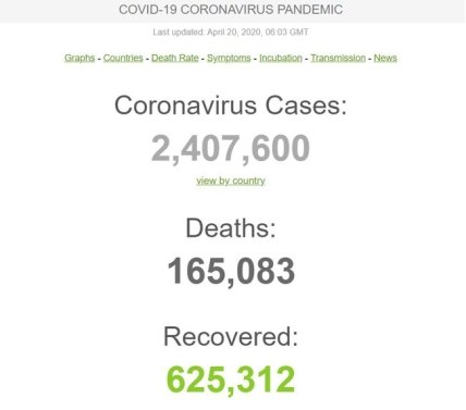 На утро 20 апреля коронавирусную болезнь COVID-19 зафиксировали у 2 407 600 человек, 165 083 пациентов умерли, 625 312 – выздоровели.